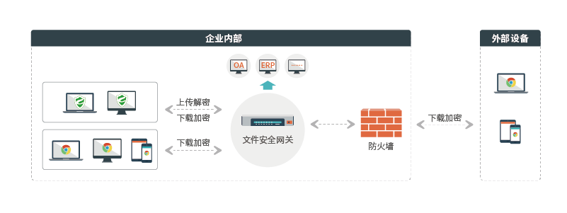 出于保护企业内部应用服务器文档的安全,驭胜推出自主研发的文件安全网关产品,其利用驭胜绿盾强大的文件加解密处理技术,将数据泄露防护与企业内部OA系统、ERP系统等应用系统良好的结合起来,可达到智能识别系统流量,对上传文件进行自动解密、下载文件自动加密的功能,防止文档有意或无意的泄露,保护企业文档安全。
