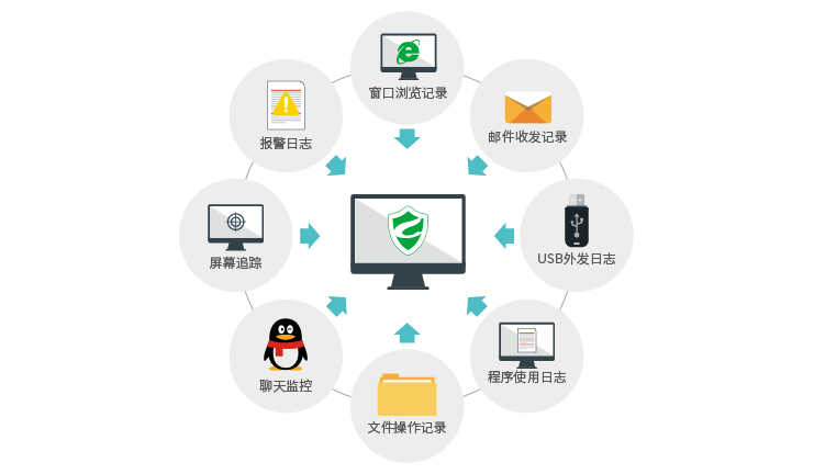 上网行为管理:内网上网监控管理进行网页浏览记录、论坛发帖记录、邮件记录、文件上传记录、聊天监视(含微信、QQ、钉钉等)、聊天工具文件监视、聊天工具图片监视、报警日志。